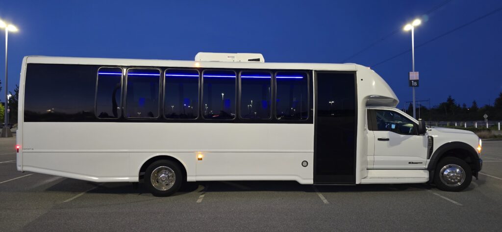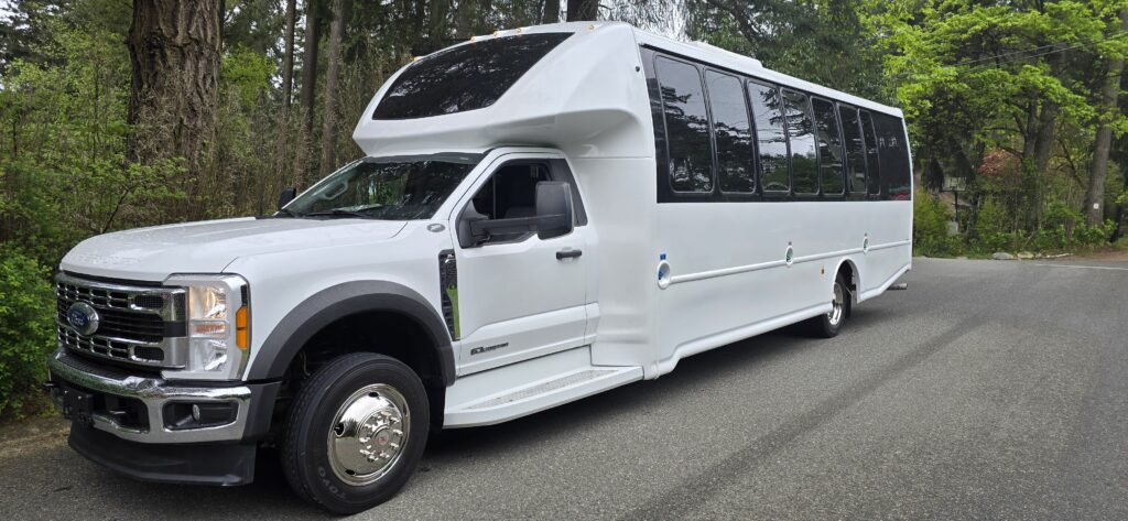 Meet our unique 2023 Ford F550 4×4 Diesel Turtle Top XL 24-passenger Touring Bus