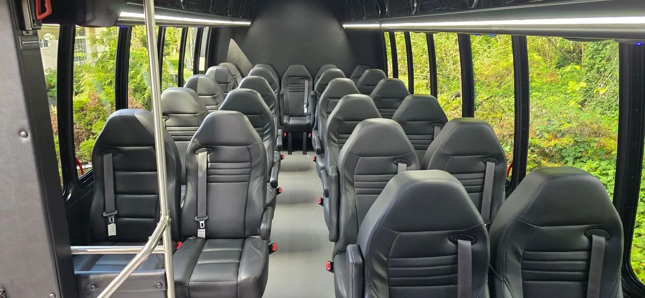 It has premier high-back leather reclining seats, 3-point seat belts, USB Charging ports everywhere, reading lights, aircon, interior upper luggage racks, a huge luggage area in the rear, and the ability to tow 12,000 lbs.